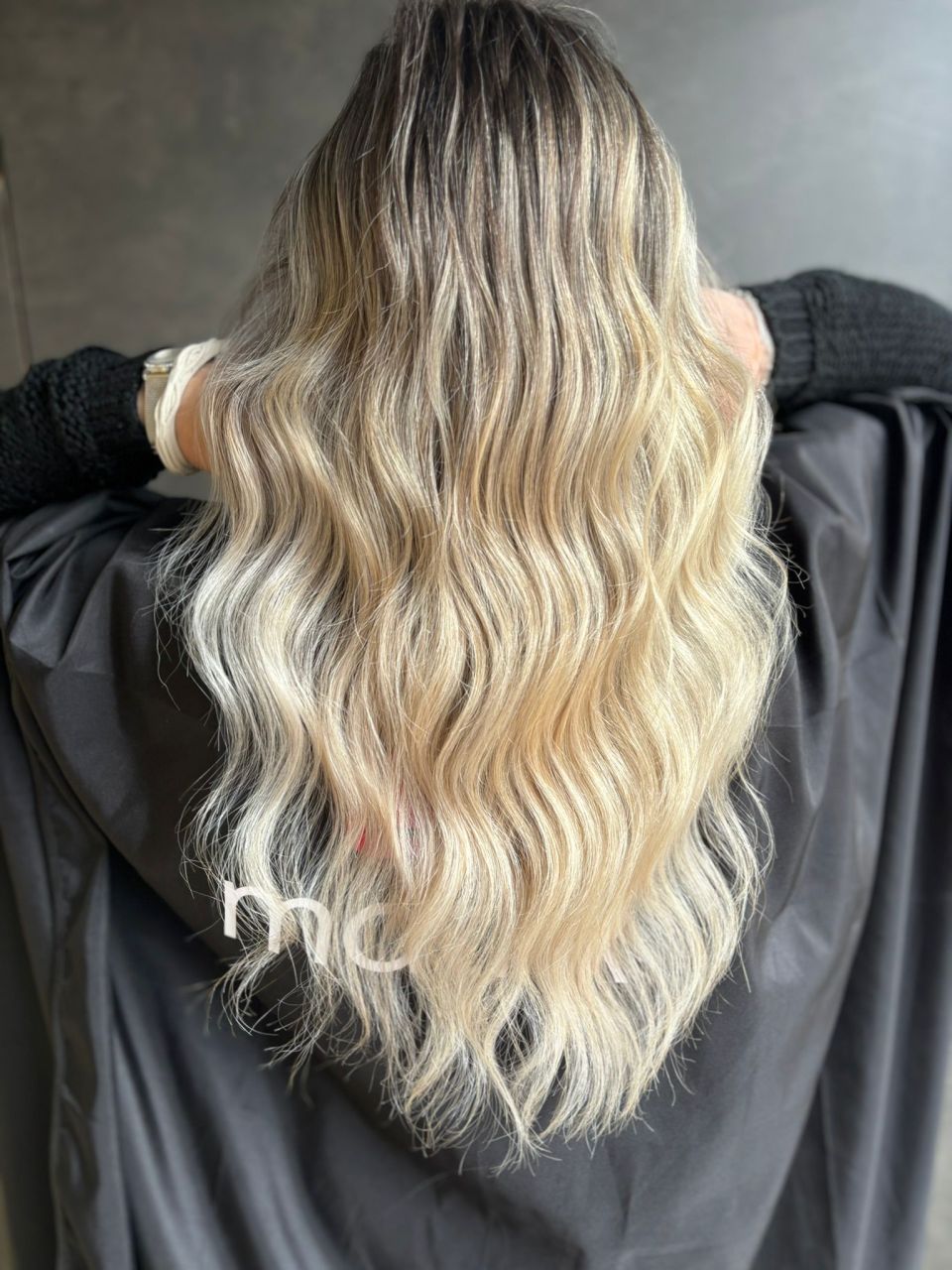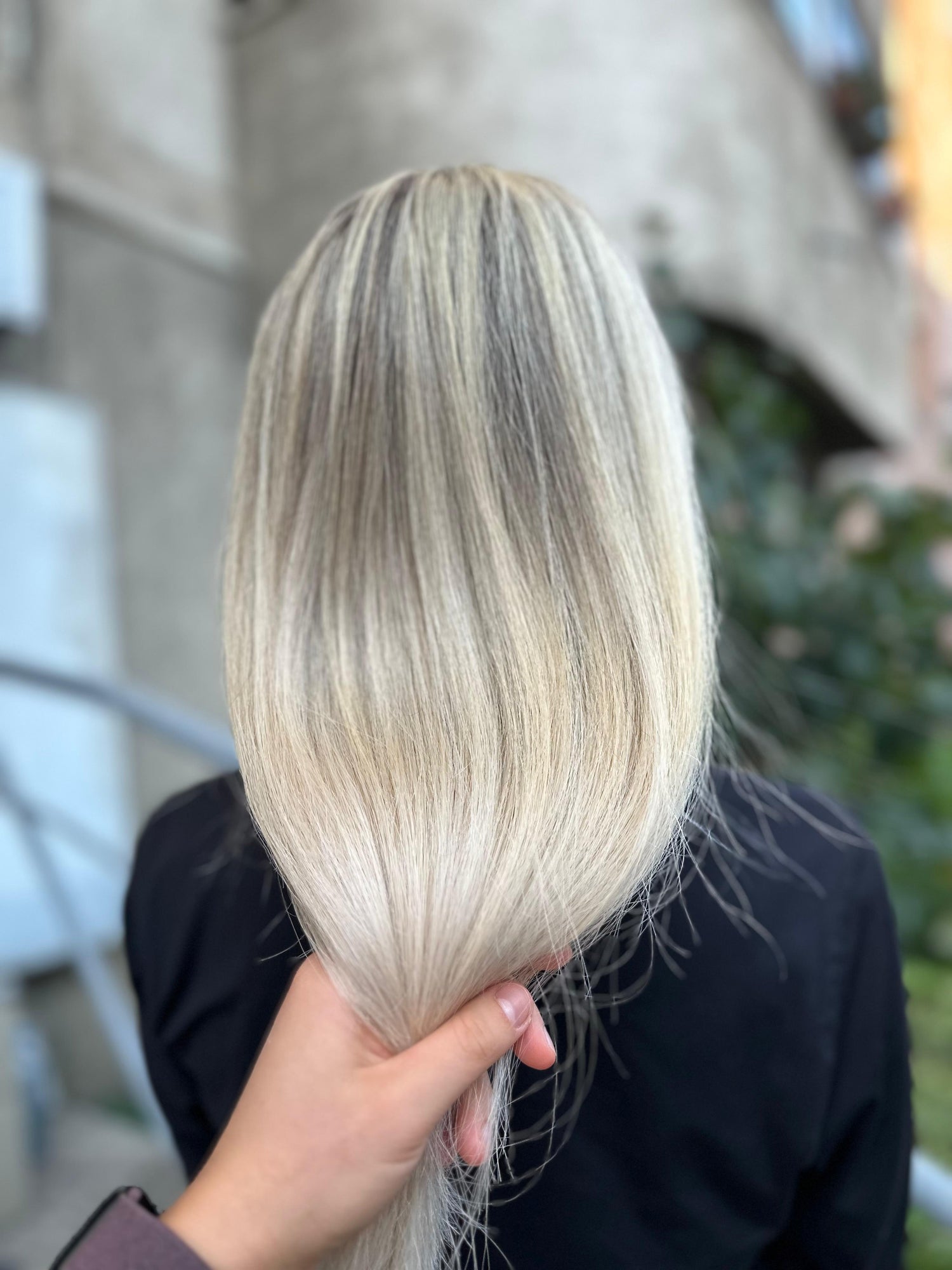 Decolorarea culorii naturale a părului în zona rădăcinilor, urmată de tonalizare. Include tratamente de protecție și reparare aplicate înainte, între și după decolorare.