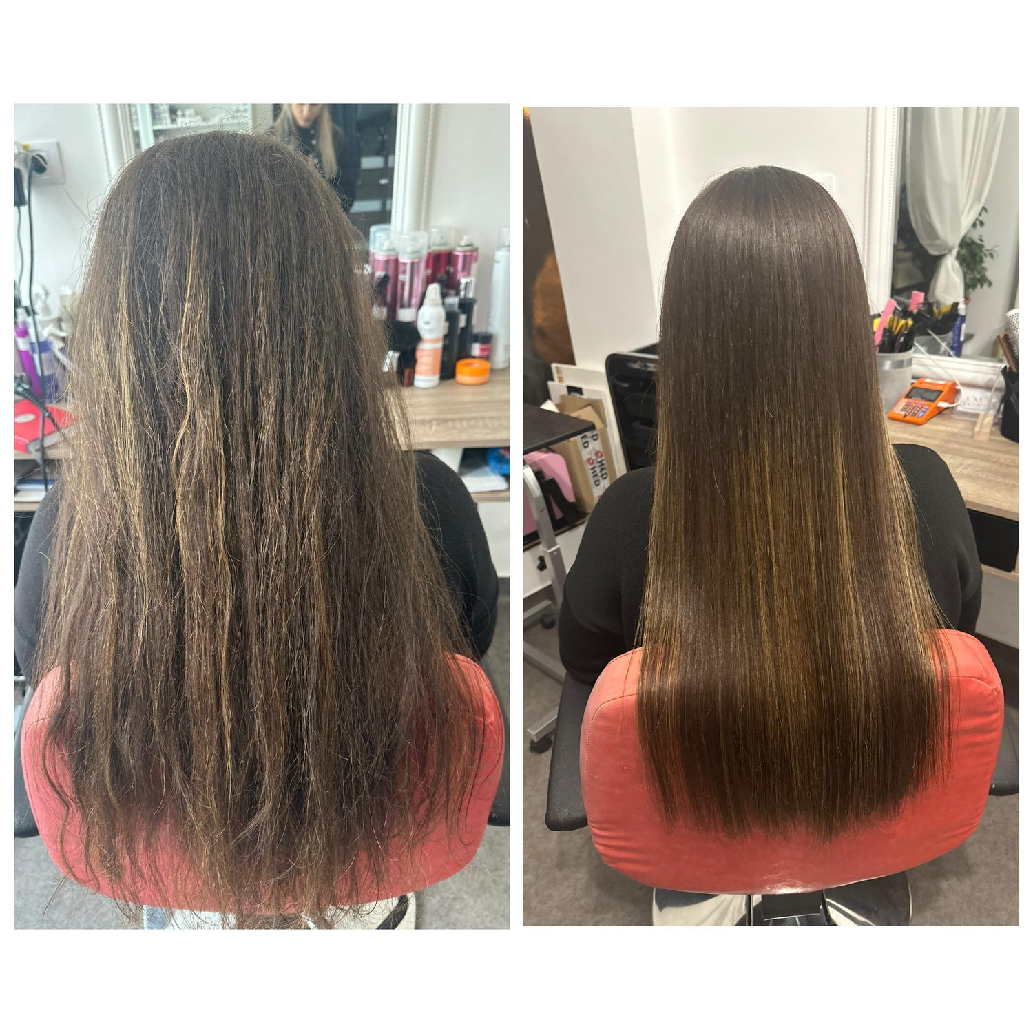 Această procedură este ideală pentru părul rebel, ondulat, creț sau descurcat greu, conferindu-i un aspect neted, fără a-l deteriora.