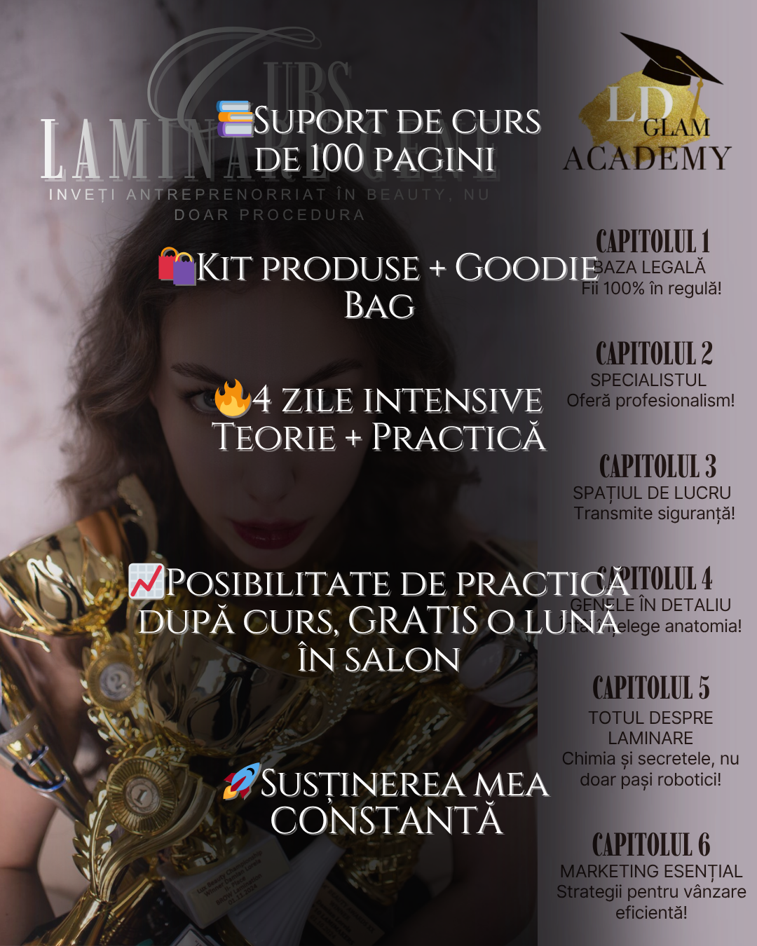 • Subiecte extinse - curs de 100 pag A4 + lista de investitie pentru buget mic/mare – nu doar procedura de laminare gene, ci absolut tot ce trebuie sa stie specialistul și elemente de antreprenoriat în beauty, astfel încât să îți construiești drumul spre succes;